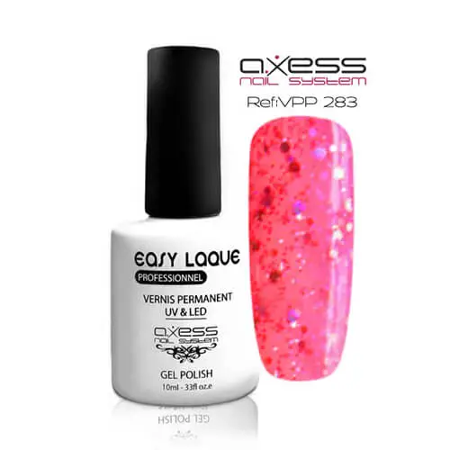 Vernis semi-permanent professionnel paillettes roses, plus de trois semaines sans s’écailler, ce catalyse sous LED ou UV.